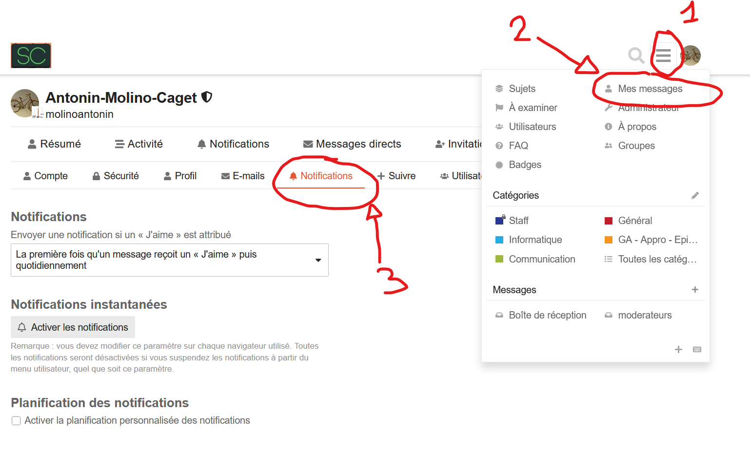 Pour paramétrer vos notifications, il suffit de cliquer dans l’ordre sur les trois boutons indiqués par un « 1 », « 2 », et « 3 » sur l’impression d’écran ci-dessous. Vous accédez alors au menu de paramétrage de vos notifications