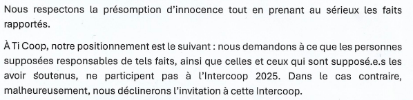 Je pense important que chacun·e prenne connaissance des éléments et notamment les organisateurices de l’intercoop : d’un côté l’intercoop est un espace libre d’échanges et de discussions, et de l’autre, si les faits sont avérés, cela me paraîtrait problématique d’autoriser des responsables d’actes de VSS à être présent·es.